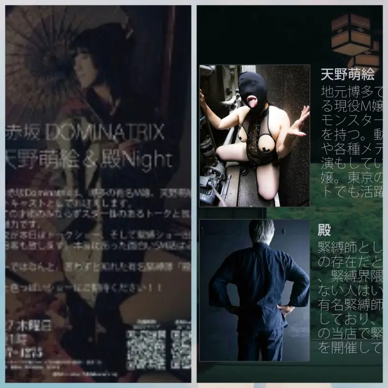 27日 赤坂Dominatrixイベント 《天野萌絵&殿Night》 博多で有名M嬢天野萌絵をゲストでおよびしてトークショー、緊縛ショーをします。縛り手は緊縛師の《殿》と共演します。ぜひ見にきて下さい(^^) PM22:30~ 03-6807-4275 #緊縛
